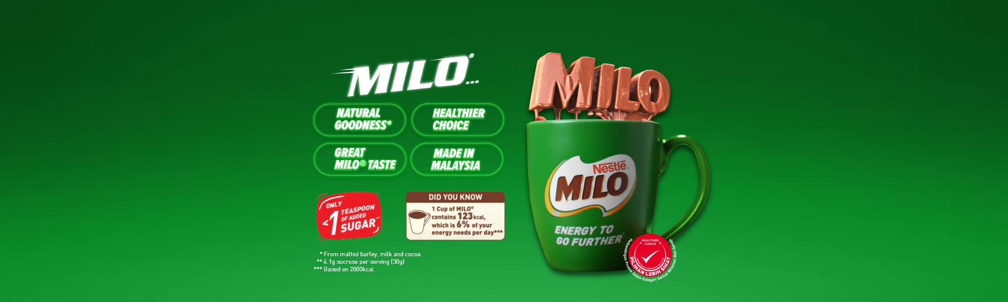 Each cup of MILO® has the natural goodness of malt barley, milk, cocoa, 6 vitamins and 3 minerals, plus only ~1 teaspoon of added sugar (sucrose). All these nutritious goodness gives you energy to take on the day!