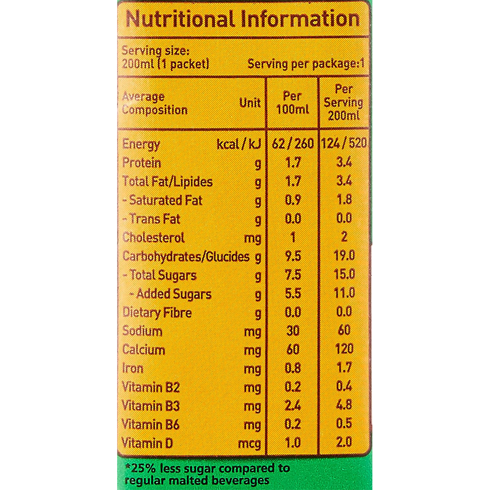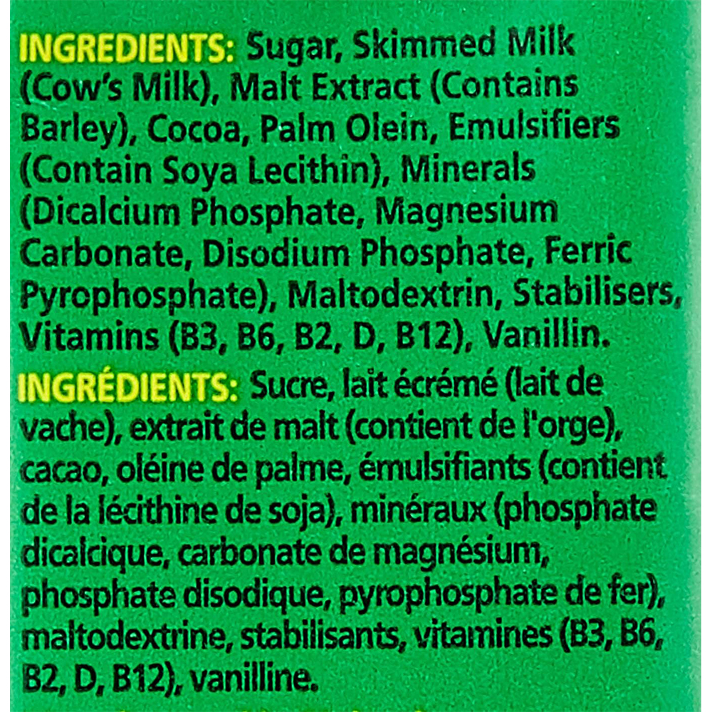 | Ingredients | Sugar, Skimmed Milk(Cow’s Milk), Malt Extract (Contains Barley), Cocoa, Palm Oil, Emulsifier, Dicalcium Phosphate, Magnesium Carbondate, Disodium Phosphate, Vitamin C, Soya Lecithin, Nicotinamide, Vanillin, Ferric Panthothenate, Vitamin B6, Vitamin B1, Vitamin B2, Biotin, |
