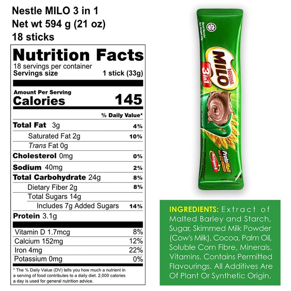 ✅ MORE CHOCOLATEY, MORE MALTY THAN THE ORIGINAL – This Milo 3-in-1 beverage mix has a RICHER taste than the Original, which is a heaven for chocolate lovers! It is conveniently packed in stick pack form to satisfy your on the go energy needs and cravings. Each bag contains 18 sticks of Milo 3-in-1 malt chocolate powder.